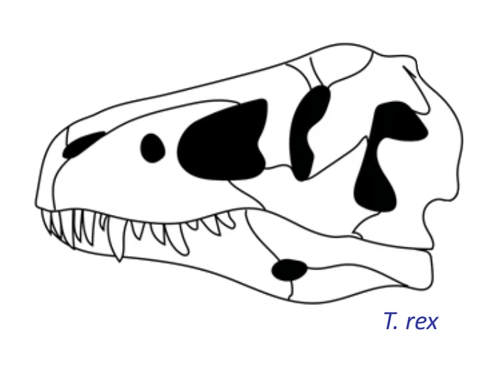Observando el fósil de un cráneo de un T.rex nos puede llamar la atención la gran cantidad de agujeros que tiene. ¿En qué agujero estaba colocado el ojo? La intuición nos dice que el ojo tiene que ocupar un agujero redondo, pero no es el caso en los T.rex.