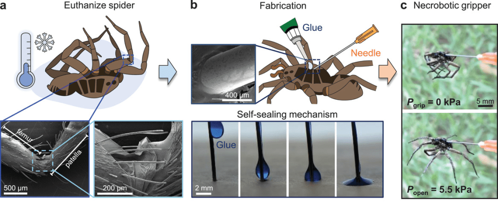 Los llamaron Necrobots («Necro-«, muerto i «-bots«, robots) y se aprovecha del mecanismo que usan las arañas para caminar. Este mecanismo depende de la presión hidráulica, en lugar de la fuerza de los músculos, para extender sus patas. El sistema mecánico da como resultado una pinza «necrobótica» que en estado natural está cerrada, y que puede abrirse al aplicar presión, levantando hasta el 130% de su propio peso.